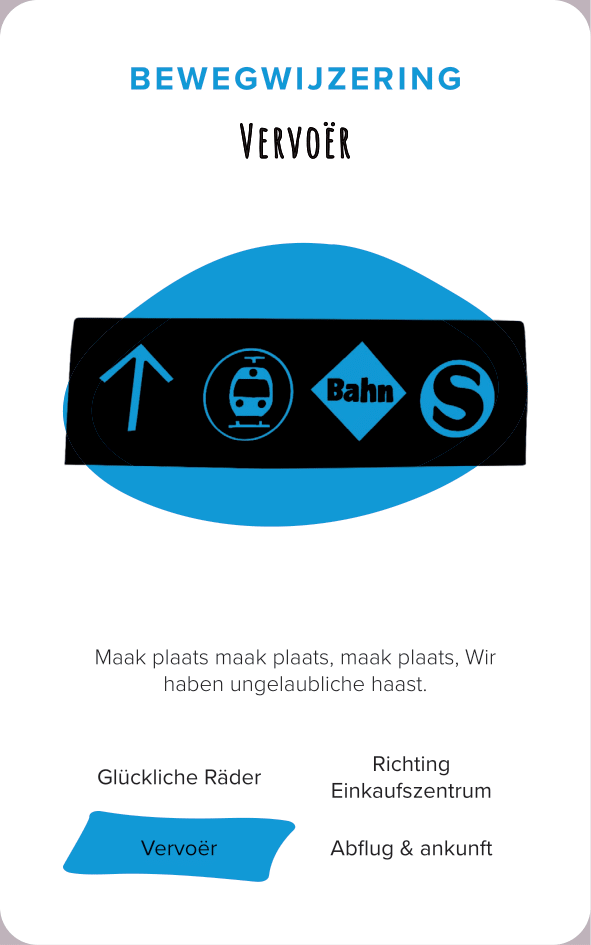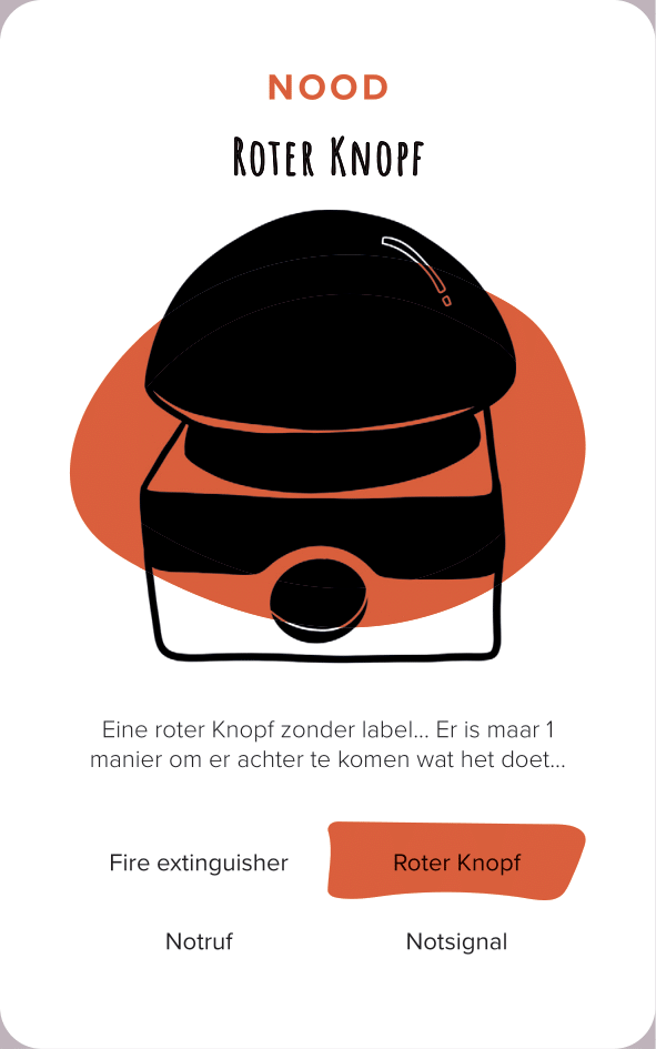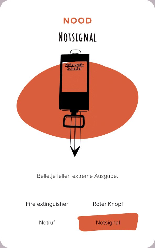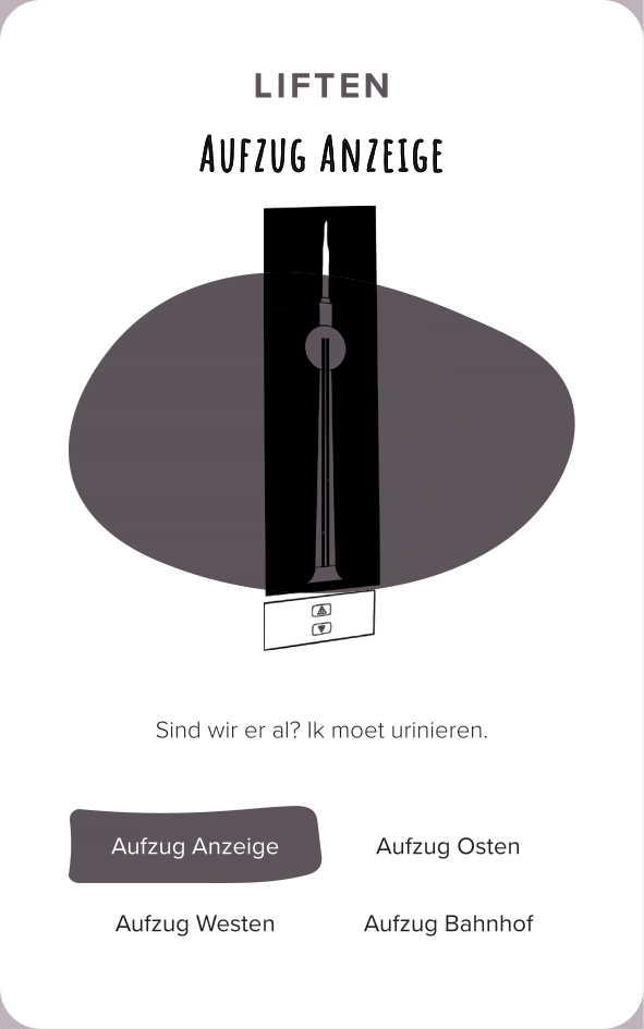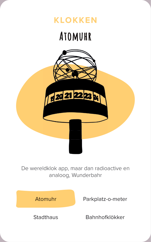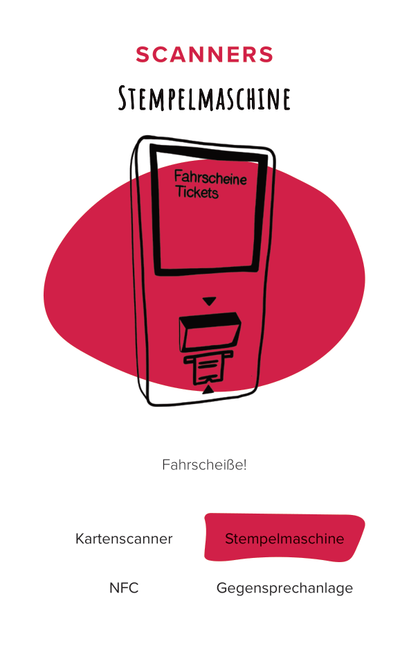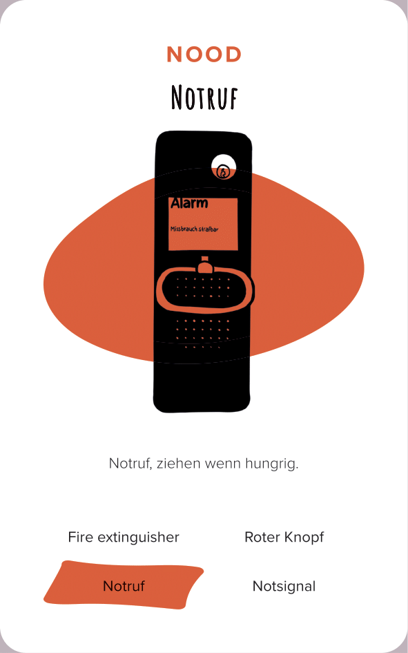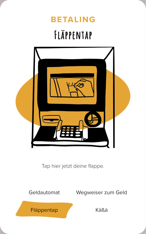 The deck of cards consists of 52 cards (and one explanation card). All the cards are categorized by color and interface. The names of the cards are made-up words that we thought were funny, providing a German-esque description of the interface.